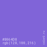 Цвет #8064D8 в цветовой модели RGB обозначается тремя октетами (128, 100, 216) в десятичном формате и #8064D8 в шестнадцатиричном (hex) формате, которые являются интенсивностью красного 128 (hex 80), интенсивность зелёного 100 (hex 64) и интенсивность синего 216 (hex D8).
