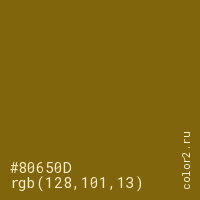 Цвет #80650D в цветовой модели RGB обозначается тремя октетами (128, 101, 13) в десятичном формате и #80650D в шестнадцатиричном (hex) формате, которые являются интенсивностью красного 128 (hex 80), интенсивность зелёного 101 (hex 65) и интенсивность синего 13 (hex 0D).