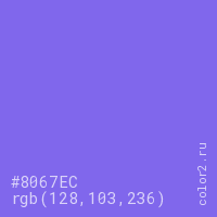 Цвет #8067EC в цветовой модели RGB обозначается тремя октетами (128, 103, 236) в десятичном формате и #8067EC в шестнадцатиричном (hex) формате, которые являются интенсивностью красного 128 (hex 80), интенсивность зелёного 103 (hex 67) и интенсивность синего 236 (hex EC).