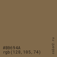 Цвет #80694A в цветовой модели RGB обозначается тремя октетами (128, 105, 74) в десятичном формате и #80694A в шестнадцатиричном (hex) формате, которые являются интенсивностью красного 128 (hex 80), интенсивность зелёного 105 (hex 69) и интенсивность синего 74 (hex 4A).