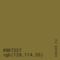 Цвет #807237 в цветовой модели RGB обозначается тремя октетами (128, 114, 55) в десятичном формате и #807237 в шестнадцатиричном (hex) формате, которые являются интенсивностью красного 128 (hex 80), интенсивность зелёного 114 (hex 72) и интенсивность синего 55 (hex 37).