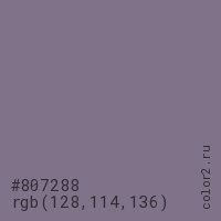 Цвет #807288 в цветовой модели RGB обозначается тремя октетами (128, 114, 136) в десятичном формате и #807288 в шестнадцатиричном (hex) формате, которые являются интенсивностью красного 128 (hex 80), интенсивность зелёного 114 (hex 72) и интенсивность синего 136 (hex 88).