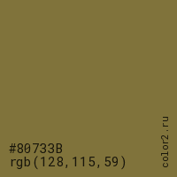 Цвет #80733B в цветовой модели RGB обозначается тремя октетами (128, 115, 59) в десятичном формате и #80733B в шестнадцатиричном (hex) формате, которые являются интенсивностью красного 128 (hex 80), интенсивность зелёного 115 (hex 73) и интенсивность синего 59 (hex 3B).
