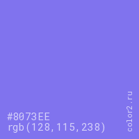 Цвет #8073EE в цветовой модели RGB обозначается тремя октетами (128, 115, 238) в десятичном формате и #8073EE в шестнадцатиричном (hex) формате, которые являются интенсивностью красного 128 (hex 80), интенсивность зелёного 115 (hex 73) и интенсивность синего 238 (hex EE).