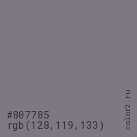Цвет #807785 в цветовой модели RGB обозначается тремя октетами (128, 119, 133) в десятичном формате и #807785 в шестнадцатиричном (hex) формате, которые являются интенсивностью красного 128 (hex 80), интенсивность зелёного 119 (hex 77) и интенсивность синего 133 (hex 85).