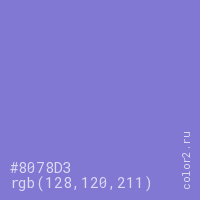 Цвет #8078D3 в цветовой модели RGB обозначается тремя октетами (128, 120, 211) в десятичном формате и #8078D3 в шестнадцатиричном (hex) формате, которые являются интенсивностью красного 128 (hex 80), интенсивность зелёного 120 (hex 78) и интенсивность синего 211 (hex D3).