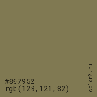 Цвет #807952 в цветовой модели RGB обозначается тремя октетами (128, 121, 82) в десятичном формате и #807952 в шестнадцатиричном (hex) формате, которые являются интенсивностью красного 128 (hex 80), интенсивность зелёного 121 (hex 79) и интенсивность синего 82 (hex 52).
