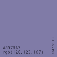 Цвет #807BA7 в цветовой модели RGB обозначается тремя октетами (128, 123, 167) в десятичном формате и #807BA7 в шестнадцатиричном (hex) формате, которые являются интенсивностью красного 128 (hex 80), интенсивность зелёного 123 (hex 7B) и интенсивность синего 167 (hex A7).