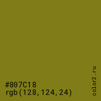 Цвет #807C18 в цветовой модели RGB обозначается тремя октетами (128, 124, 24) в десятичном формате и #807C18 в шестнадцатиричном (hex) формате, которые являются интенсивностью красного 128 (hex 80), интенсивность зелёного 124 (hex 7C) и интенсивность синего 24 (hex 18).