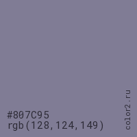 Цвет #807C95 в цветовой модели RGB обозначается тремя октетами (128, 124, 149) в десятичном формате и #807C95 в шестнадцатиричном (hex) формате, которые являются интенсивностью красного 128 (hex 80), интенсивность зелёного 124 (hex 7C) и интенсивность синего 149 (hex 95).