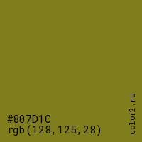 Цвет #807D1C в цветовой модели RGB обозначается тремя октетами (128, 125, 28) в десятичном формате и #807D1C в шестнадцатиричном (hex) формате, которые являются интенсивностью красного 128 (hex 80), интенсивность зелёного 125 (hex 7D) и интенсивность синего 28 (hex 1C).