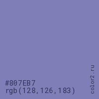 Цвет #807EB7 в цветовой модели RGB обозначается тремя октетами (128, 126, 183) в десятичном формате и #807EB7 в шестнадцатиричном (hex) формате, которые являются интенсивностью красного 128 (hex 80), интенсивность зелёного 126 (hex 7E) и интенсивность синего 183 (hex B7).