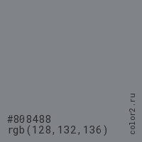 Цвет #808488 в цветовой модели RGB обозначается тремя октетами (128, 132, 136) в десятичном формате и #808488 в шестнадцатиричном (hex) формате, которые являются интенсивностью красного 128 (hex 80), интенсивность зелёного 132 (hex 84) и интенсивность синего 136 (hex 88).
