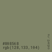 Цвет #808568 в цветовой модели RGB обозначается тремя октетами (128, 133, 104) в десятичном формате и #808568 в шестнадцатиричном (hex) формате, которые являются интенсивностью красного 128 (hex 80), интенсивность зелёного 133 (hex 85) и интенсивность синего 104 (hex 68).