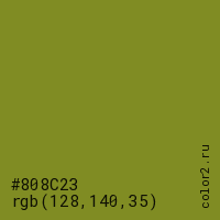 Цвет #808C23 в цветовой модели RGB обозначается тремя октетами (128, 140, 35) в десятичном формате и #808C23 в шестнадцатиричном (hex) формате, которые являются интенсивностью красного 128 (hex 80), интенсивность зелёного 140 (hex 8C) и интенсивность синего 35 (hex 23).