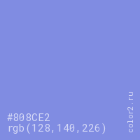 Цвет #808CE2 в цветовой модели RGB обозначается тремя октетами (128, 140, 226) в десятичном формате и #808CE2 в шестнадцатиричном (hex) формате, которые являются интенсивностью красного 128 (hex 80), интенсивность зелёного 140 (hex 8C) и интенсивность синего 226 (hex E2).