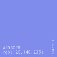 Цвет #808CEB в цветовой модели RGB обозначается тремя октетами (128, 140, 235) в десятичном формате и #808CEB в шестнадцатиричном (hex) формате, которые являются интенсивностью красного 128 (hex 80), интенсивность зелёного 140 (hex 8C) и интенсивность синего 235 (hex EB).