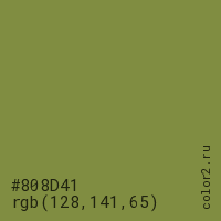Цвет #808D41 в цветовой модели RGB обозначается тремя октетами (128, 141, 65) в десятичном формате и #808D41 в шестнадцатиричном (hex) формате, которые являются интенсивностью красного 128 (hex 80), интенсивность зелёного 141 (hex 8D) и интенсивность синего 65 (hex 41).