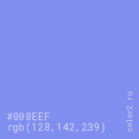 Цвет #808EEF в цветовой модели RGB обозначается тремя октетами (128, 142, 239) в десятичном формате и #808EEF в шестнадцатиричном (hex) формате, которые являются интенсивностью красного 128 (hex 80), интенсивность зелёного 142 (hex 8E) и интенсивность синего 239 (hex EF).