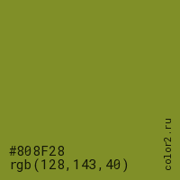 Цвет #808F28 в цветовой модели RGB обозначается тремя октетами (128, 143, 40) в десятичном формате и #808F28 в шестнадцатиричном (hex) формате, которые являются интенсивностью красного 128 (hex 80), интенсивность зелёного 143 (hex 8F) и интенсивность синего 40 (hex 28).