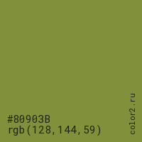 Цвет #80903B в цветовой модели RGB обозначается тремя октетами (128, 144, 59) в десятичном формате и #80903B в шестнадцатиричном (hex) формате, которые являются интенсивностью красного 128 (hex 80), интенсивность зелёного 144 (hex 90) и интенсивность синего 59 (hex 3B).
