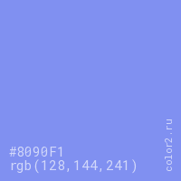 Цвет #8090F1 в цветовой модели RGB обозначается тремя октетами (128, 144, 241) в десятичном формате и #8090F1 в шестнадцатиричном (hex) формате, которые являются интенсивностью красного 128 (hex 80), интенсивность зелёного 144 (hex 90) и интенсивность синего 241 (hex F1).