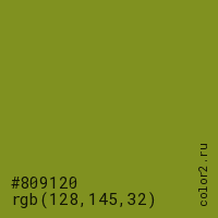 Цвет #809120 в цветовой модели RGB обозначается тремя октетами (128, 145, 32) в десятичном формате и #809120 в шестнадцатиричном (hex) формате, которые являются интенсивностью красного 128 (hex 80), интенсивность зелёного 145 (hex 91) и интенсивность синего 32 (hex 20).