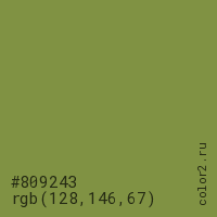 Цвет #809243 в цветовой модели RGB обозначается тремя октетами (128, 146, 67) в десятичном формате и #809243 в шестнадцатиричном (hex) формате, которые являются интенсивностью красного 128 (hex 80), интенсивность зелёного 146 (hex 92) и интенсивность синего 67 (hex 43).