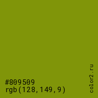 Цвет #809509 в цветовой модели RGB обозначается тремя октетами (128, 149, 9) в десятичном формате и #809509 в шестнадцатиричном (hex) формате, которые являются интенсивностью красного 128 (hex 80), интенсивность зелёного 149 (hex 95) и интенсивность синего 9 (hex 09).