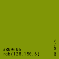 Цвет #809606 в цветовой модели RGB обозначается тремя октетами (128, 150, 6) в десятичном формате и #809606 в шестнадцатиричном (hex) формате, которые являются интенсивностью красного 128 (hex 80), интенсивность зелёного 150 (hex 96) и интенсивность синего 6 (hex 06).