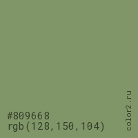 Цвет #809668 в цветовой модели RGB обозначается тремя октетами (128, 150, 104) в десятичном формате и #809668 в шестнадцатиричном (hex) формате, которые являются интенсивностью красного 128 (hex 80), интенсивность зелёного 150 (hex 96) и интенсивность синего 104 (hex 68).