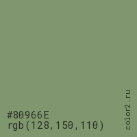 Цвет #80966E в цветовой модели RGB обозначается тремя октетами (128, 150, 110) в десятичном формате и #80966E в шестнадцатиричном (hex) формате, которые являются интенсивностью красного 128 (hex 80), интенсивность зелёного 150 (hex 96) и интенсивность синего 110 (hex 6E).