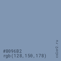 Цвет #8096B2 в цветовой модели RGB обозначается тремя октетами (128, 150, 178) в десятичном формате и #8096B2 в шестнадцатиричном (hex) формате, которые являются интенсивностью красного 128 (hex 80), интенсивность зелёного 150 (hex 96) и интенсивность синего 178 (hex B2).