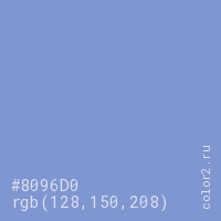 Цвет #8096D0 в цветовой модели RGB обозначается тремя октетами (128, 150, 208) в десятичном формате и #8096D0 в шестнадцатиричном (hex) формате, которые являются интенсивностью красного 128 (hex 80), интенсивность зелёного 150 (hex 96) и интенсивность синего 208 (hex D0).