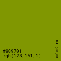 Цвет #809701 в цветовой модели RGB обозначается тремя октетами (128, 151, 1) в десятичном формате и #809701 в шестнадцатиричном (hex) формате, которые являются интенсивностью красного 128 (hex 80), интенсивность зелёного 151 (hex 97) и интенсивность синего 1 (hex 01).