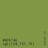Цвет #809746 в цветовой модели RGB обозначается тремя октетами (128, 151, 70) в десятичном формате и #809746 в шестнадцатиричном (hex) формате, которые являются интенсивностью красного 128 (hex 80), интенсивность зелёного 151 (hex 97) и интенсивность синего 70 (hex 46).