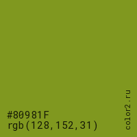 Цвет #80981F в цветовой модели RGB обозначается тремя октетами (128, 152, 31) в десятичном формате и #80981F в шестнадцатиричном (hex) формате, которые являются интенсивностью красного 128 (hex 80), интенсивность зелёного 152 (hex 98) и интенсивность синего 31 (hex 1F).