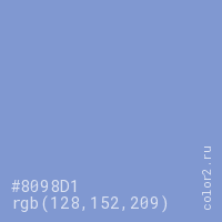Цвет #8098D1 в цветовой модели RGB обозначается тремя октетами (128, 152, 209) в десятичном формате и #8098D1 в шестнадцатиричном (hex) формате, которые являются интенсивностью красного 128 (hex 80), интенсивность зелёного 152 (hex 98) и интенсивность синего 209 (hex D1).