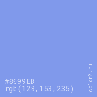 Цвет #8099EB в цветовой модели RGB обозначается тремя октетами (128, 153, 235) в десятичном формате и #8099EB в шестнадцатиричном (hex) формате, которые являются интенсивностью красного 128 (hex 80), интенсивность зелёного 153 (hex 99) и интенсивность синего 235 (hex EB).