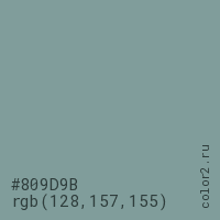 Цвет #809D9B в цветовой модели RGB обозначается тремя октетами (128, 157, 155) в десятичном формате и #809D9B в шестнадцатиричном (hex) формате, которые являются интенсивностью красного 128 (hex 80), интенсивность зелёного 157 (hex 9D) и интенсивность синего 155 (hex 9B).