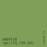 Цвет #809F58 в цветовой модели RGB обозначается тремя октетами (128, 159, 88) в десятичном формате и #809F58 в шестнадцатиричном (hex) формате, которые являются интенсивностью красного 128 (hex 80), интенсивность зелёного 159 (hex 9F) и интенсивность синего 88 (hex 58).