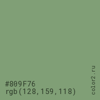 Цвет #809F76 в цветовой модели RGB обозначается тремя октетами (128, 159, 118) в десятичном формате и #809F76 в шестнадцатиричном (hex) формате, которые являются интенсивностью красного 128 (hex 80), интенсивность зелёного 159 (hex 9F) и интенсивность синего 118 (hex 76).