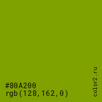 Цвет #80A200 в цветовой модели RGB обозначается тремя октетами (128, 162, 0) в десятичном формате и #80A200 в шестнадцатиричном (hex) формате, которые являются интенсивностью красного 128 (hex 80), интенсивность зелёного 162 (hex A2) и интенсивность синего 0 (hex 00).