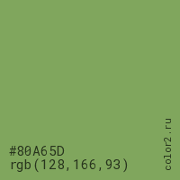 Цвет #80A65D в цветовой модели RGB обозначается тремя октетами (128, 166, 93) в десятичном формате и #80A65D в шестнадцатиричном (hex) формате, которые являются интенсивностью красного 128 (hex 80), интенсивность зелёного 166 (hex A6) и интенсивность синего 93 (hex 5D).