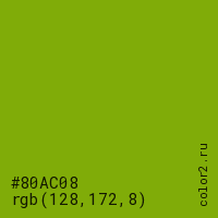 Цвет #80AC08 в цветовой модели RGB обозначается тремя октетами (128, 172, 8) в десятичном формате и #80AC08 в шестнадцатиричном (hex) формате, которые являются интенсивностью красного 128 (hex 80), интенсивность зелёного 172 (hex AC) и интенсивность синего 8 (hex 08).