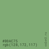Цвет #80AC75 в цветовой модели RGB обозначается тремя октетами (128, 172, 117) в десятичном формате и #80AC75 в шестнадцатиричном (hex) формате, которые являются интенсивностью красного 128 (hex 80), интенсивность зелёного 172 (hex AC) и интенсивность синего 117 (hex 75).
