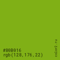 Цвет #80B016 в цветовой модели RGB обозначается тремя октетами (128, 176, 22) в десятичном формате и #80B016 в шестнадцатиричном (hex) формате, которые являются интенсивностью красного 128 (hex 80), интенсивность зелёного 176 (hex B0) и интенсивность синего 22 (hex 16).