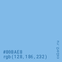 Цвет #80BAE8 в цветовой модели RGB обозначается тремя октетами (128, 186, 232) в десятичном формате и #80BAE8 в шестнадцатиричном (hex) формате, которые являются интенсивностью красного 128 (hex 80), интенсивность зелёного 186 (hex BA) и интенсивность синего 232 (hex E8).