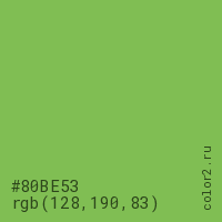 Цвет #80BE53 в цветовой модели RGB обозначается тремя октетами (128, 190, 83) в десятичном формате и #80BE53 в шестнадцатиричном (hex) формате, которые являются интенсивностью красного 128 (hex 80), интенсивность зелёного 190 (hex BE) и интенсивность синего 83 (hex 53).
