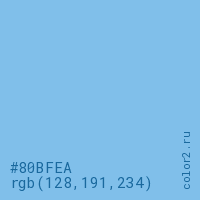 Цвет #80BFEA в цветовой модели RGB обозначается тремя октетами (128, 191, 234) в десятичном формате и #80BFEA в шестнадцатиричном (hex) формате, которые являются интенсивностью красного 128 (hex 80), интенсивность зелёного 191 (hex BF) и интенсивность синего 234 (hex EA).